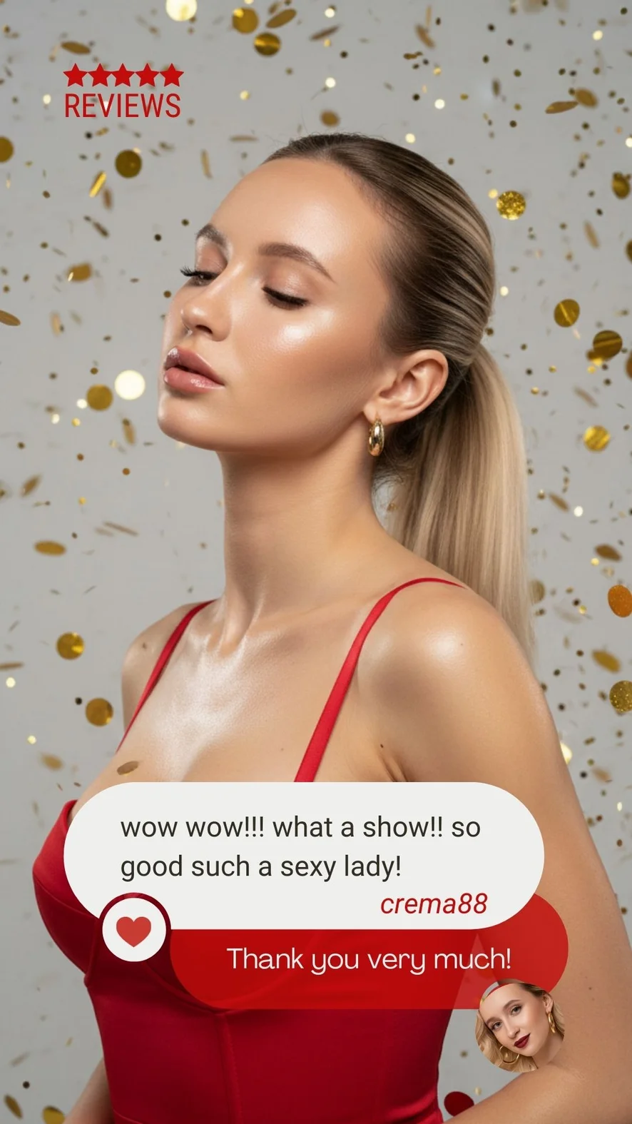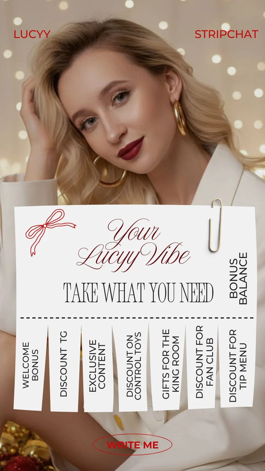 요가, 하이힐, 재갈, 가죽, 코르셋, 코스프레, 스모킹, 라텍스, 트월킹, 풋 페티시, 아헤가오, 카멜토우, 미스트레스(여주인), 음란한 대화, 플래싱, 젖소, 도기 스타일, 자지 평점, 나일론, 굴욕, 샤워, 페이셜, 자위, 블로우잡, 섹스 기구, 분수, 스트립쇼, 상의탈의, 스팽킹, 오일 쇼, 에로틱 댄스